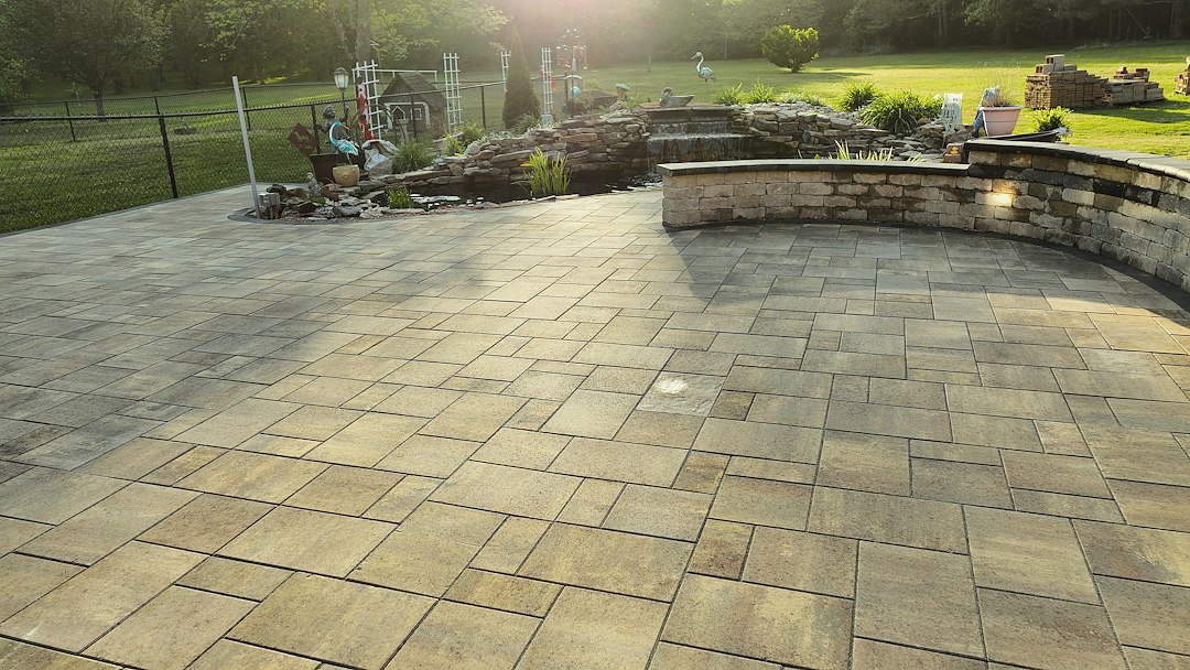 We installed pavers and wall block in a Savannah color, which offered warm tan and red tones. Those tones complemented the natural stone used around the koi pond, creating a unified look between the new hardscape and the water feature. Black accents were added in both the patio and the seating wall to give the area a custom, finished touch and to provide contrast that highlights the shapes and edges of the new work.