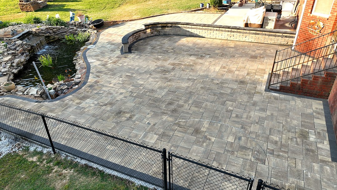 Design and function were both important on this project. Our team took care to place the pavers so that the walkways and the patio flow naturally to the pond and other backyard areas. The pattern and color choices were selected to match the pond stone, and the black accent pieces were placed to frame key sightlines. This balance of form and function means the space looks intentional and is easy to use for everyday living and entertaining.